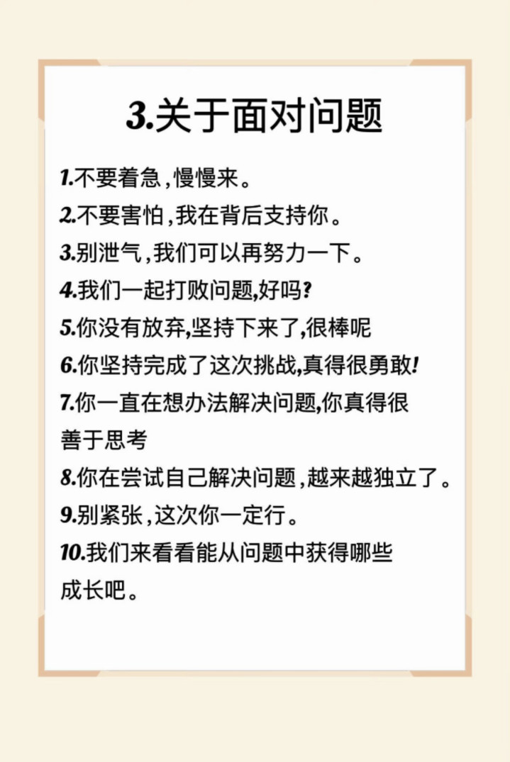生存中不免遭受难题,此时父母的话是孩子濒临问题的勇气起首。当孩子遭受曲折,先安抚热枕“不要暴躁,渐渐来”“不要发怵,我在背后复古你”,让他们知说念不是独自濒临。