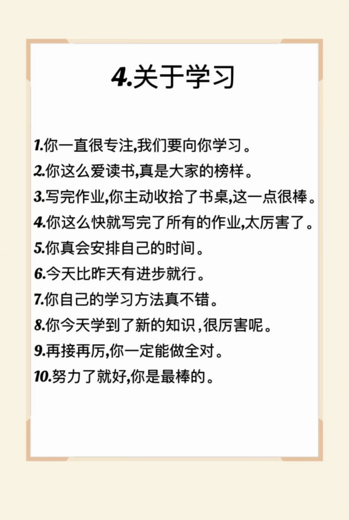 在学习方面,要关心经过而非效力。当孩子专注学习时,确定他们的格调“你一直很专注,咱们要向你学习”;当孩子主动打理书桌、安排技术,表扬他们的俗例“写完功课,你主动打理了书桌,这小数很棒”“你真会安排我方的技术”。