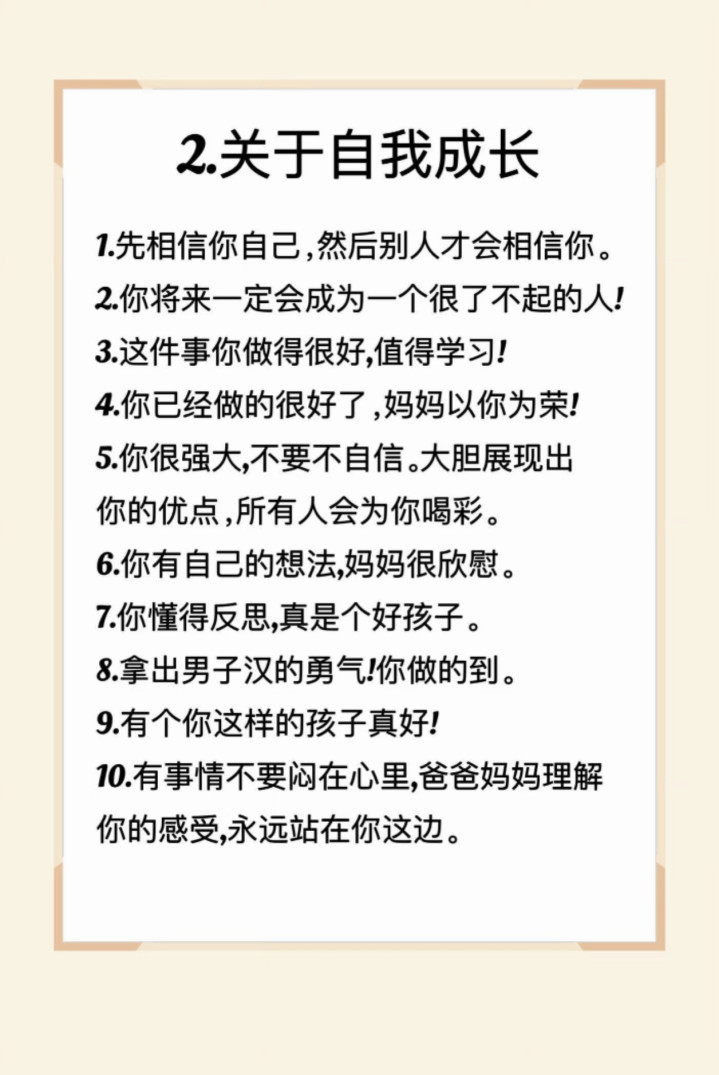 父母的话语,是孩子成长路上的阳光。一句和顺的话,能点亮孩子的内心,让他们充满底气和力量。今天整理了40句“彩虹屁”,涵盖活动俗例、自我成长、濒临问题、学习四个方面,外行爸妈马上码住,用对话语的力量,养出眼里有光、心中有爱的孩子。