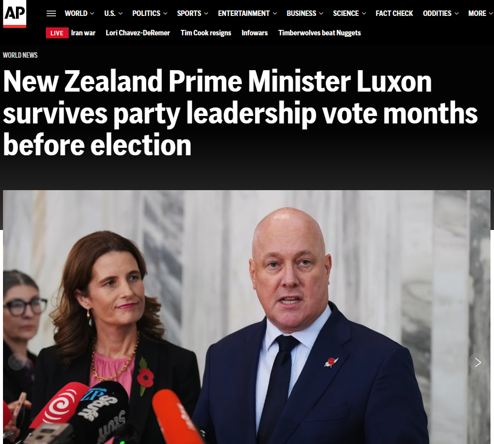 开云体育官方网站 修起外界筹划 新西兰总理称在本党议员信任投票中过关