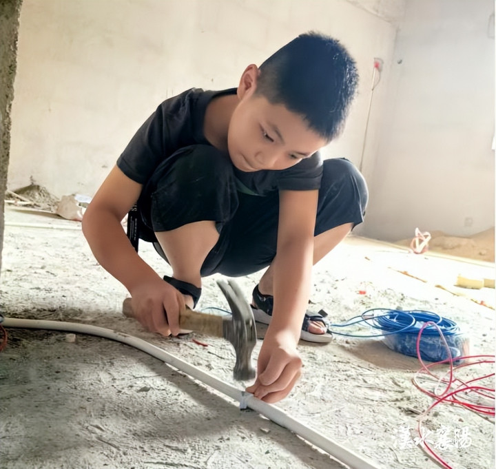 炽热的工地上,12岁的扬扬赤膊上阵,手脚娴熟地穿电线、缠胶布、钉线管,汗水湿透全身。
