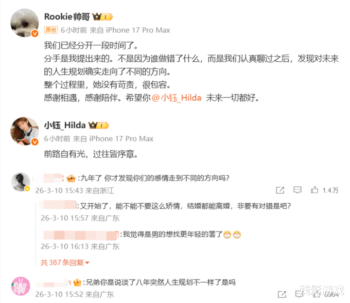 在LPL电竞圈内,要说到“情侣”这个词,思必寰球都能联思到几对,就比如Uzi和奥咪咪,管泽元和余霜,还有Doinb和糖小幽。这三对如今亦然修成正果,有了小枣和小金,Uzi更是儿女双全,成为了LPL电竞圈内的顺利东说念主士。除了他们除外,LPL还有一双步伐情侣Rookie和小钰,这两东说念主的式样一直可以,虽说莫得传出要受室的讯息,但谁也没思到等来的却是“官宣离婚”。Rookie这边的发文是:咱们仍是分开了一段时分,离婚是我建议来的,细密聊过,发现对昔时的打算走向了不同地方。