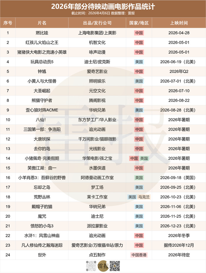 据雷报不完全统计,当今已有24部中外动画电影官宣音问或厚爱定档(包含国外商场定档),其中有15部国产动画(含中外合拍)以及9部国外动画,具体情况如下: