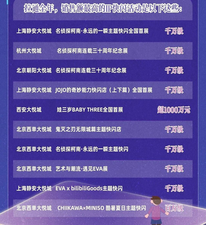 但偏巧雪上加霜的是,《哪吒》级别的全民爆款不敢再奢想,连日本动漫这一大援手也一刹“噤声”。自客岁《鬼灭之刃》上映后,受“车力巨东谈主事件”身分影响,开年于今尚无一部日本动画电影登陆国内院线。票房归天还在其次,更辣手的是对本就承压的IP养殖授权商场的再补一刀——大悦城2025年销售额TOP10快闪中,有9场来自日漫IP。而本年,又要由谁来填补这个空白呢?