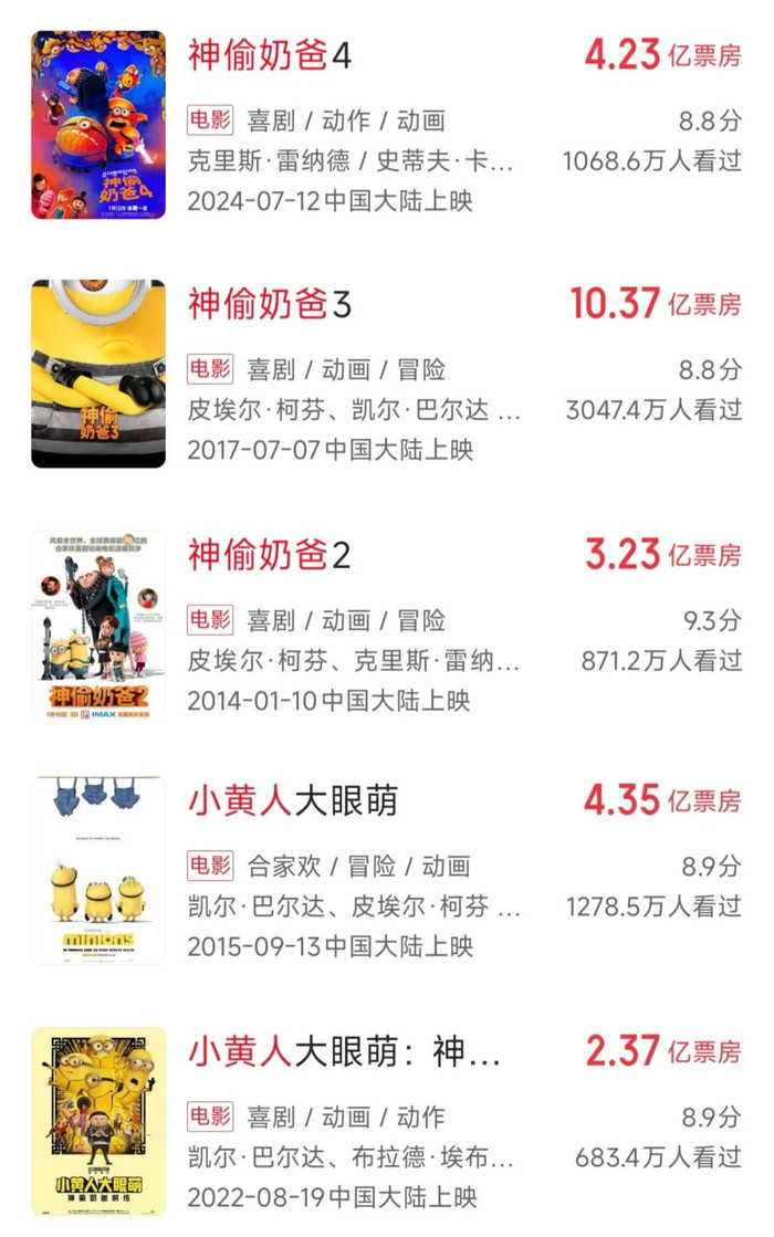 这其中,从前作在中国大陆商场的票房进展来看,最值得期待的是小黄东谈主系列的第三部作品《小黄东谈主与大怪兽》。包括《神偷奶爸》系列在内,小黄东谈主IP在国内上映的5部电影累计票房达到了24.58亿元,单片更有超10亿票房的佳绩。小黄东谈主IP在国内养殖授权商场的买卖价值更是无需赘言,围绕电影上映这一紧要节点,本年小黄东谈主IP有关的附进和联名有望收尾大卖。