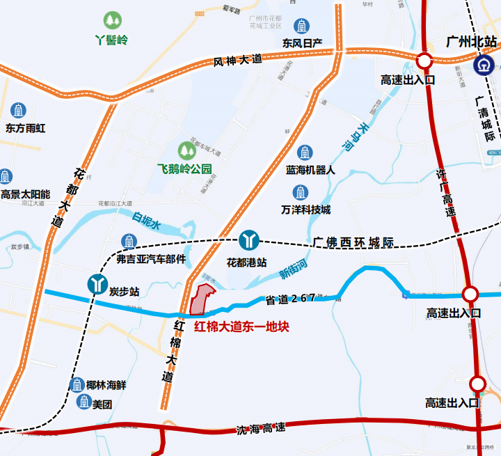 位于花齐西部智能新动力汽车城,红棉通衢以东,北侧紧邻花齐港。周边产业园区繁密,优质企业汇注,产业基础精致,交通便利。距离广佛西环城际花齐港站1公里,广州北站7.5公里。