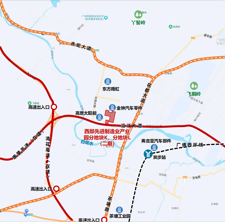 位于花齐西部智能新动力汽车城,沿江通衢以北花齐通衢西侧,紧邻在建惠肇高速,距离南侧广州绕城高速收费站约4.5公里,交通较为便利,周边产业较为汇注。距离广佛西环线城际炭步站2.8公里。